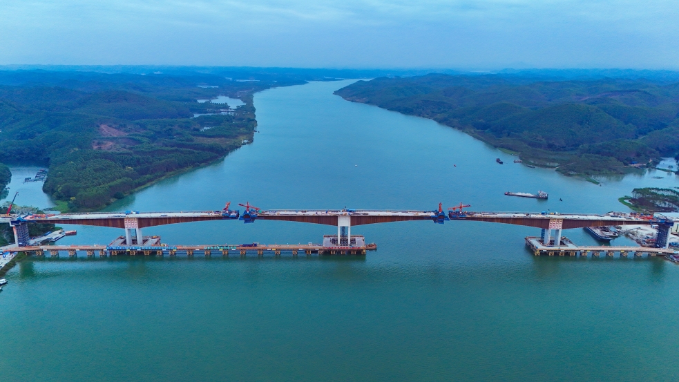 圖為飛龍大橋主跨合龍?jiān)诩?/span>