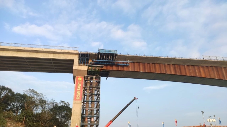 飛龍大橋是S210橫縣平馬至靈山沙坪公路關(guān)鍵控制性工程,大橋全長940米,主橋橋跨布置為(100+185+185+100)米波形鋼腹板連續(xù)剛構(gòu),是當(dāng)前廣西普通國省干線中創(chuàng)新程度最高、建設(shè)技術(shù)最難、最具代表性的跨江大橋之一,建成后將成為“世界最大跨徑1800型波形鋼腹板鋼-混組合結(jié)構(gòu)連續(xù)剛構(gòu)橋”。
